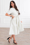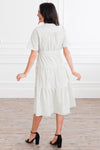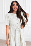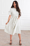 We are quiet obsessed with the super soft feel corduroy and darling soft sage color of our new Tamra dress! This modest lovely tea length dress features short sleeves, functional button front, belt tie waist and an even cuter tier skirt.