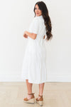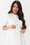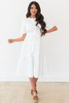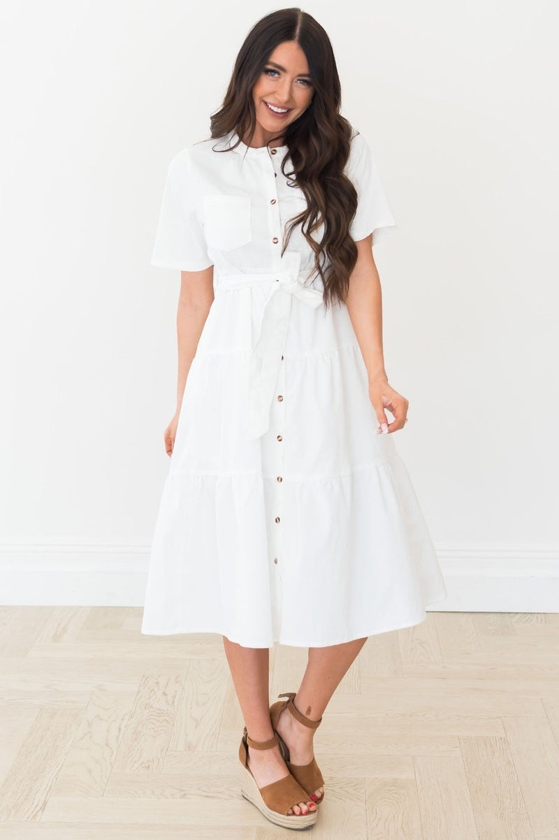 We are quiet obsessed with the super soft feel corduroy and darling white color of our new Tamra dress! This modest lovely tea length dress features short sleeves, functional button front, belt tie waist and an even cuter tier skirt.