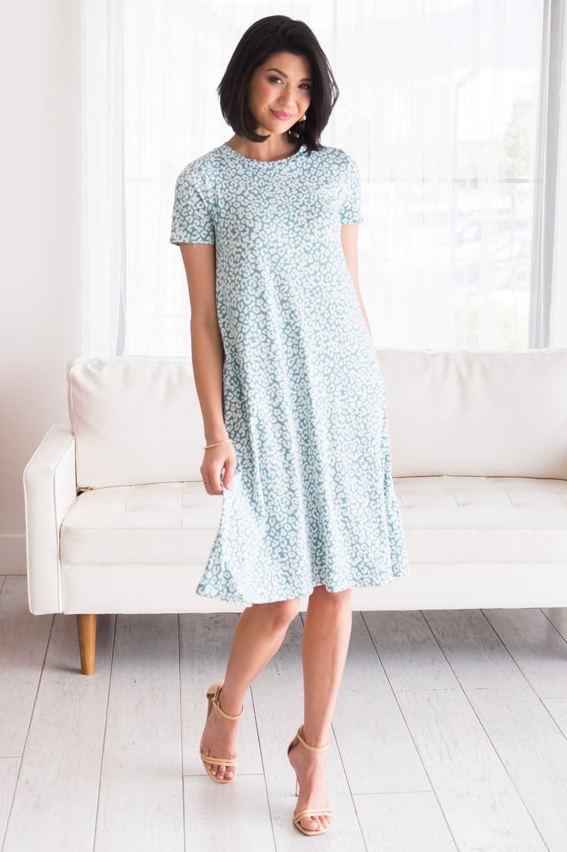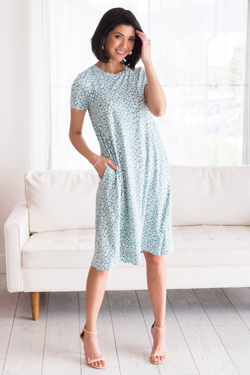 We cannot get enough of modest swing dresses! Especially ones with gorgeous leopard print and pockets! This cute swing dress features; shorts sleeves, round modest neckline, pockets, buttery soft material, the perfect midi length. These beauties are going to fly out of our boutique faster than they came in so be sure to snag yours!