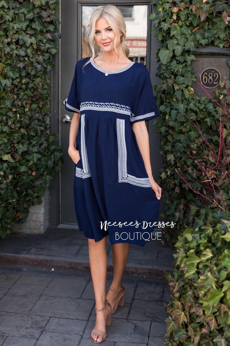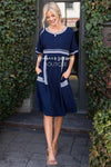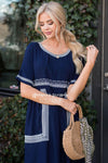 Sail away with us and this gorgeous New Tarrah dress! Perfect spring & summer dress has got us dreaming of sunshiny days! Featuring rounded neckline, short sleeves, is fully lined and has pockets. The most darling feature is the lovely pop of ivory embroidery detail! Simply can not go wrong with this beauty!