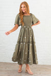 Currently falling in love with the new Tarryn! This lovely dress has stolen our hearts and we know it will be the perfect dress for Fall! Features include gorgeous daisy embroidery on the flowy tiered skirt, smocked bodice and our all time favorite short flutter sleeves. Get yours now before they are gone!