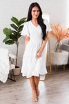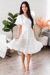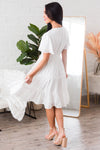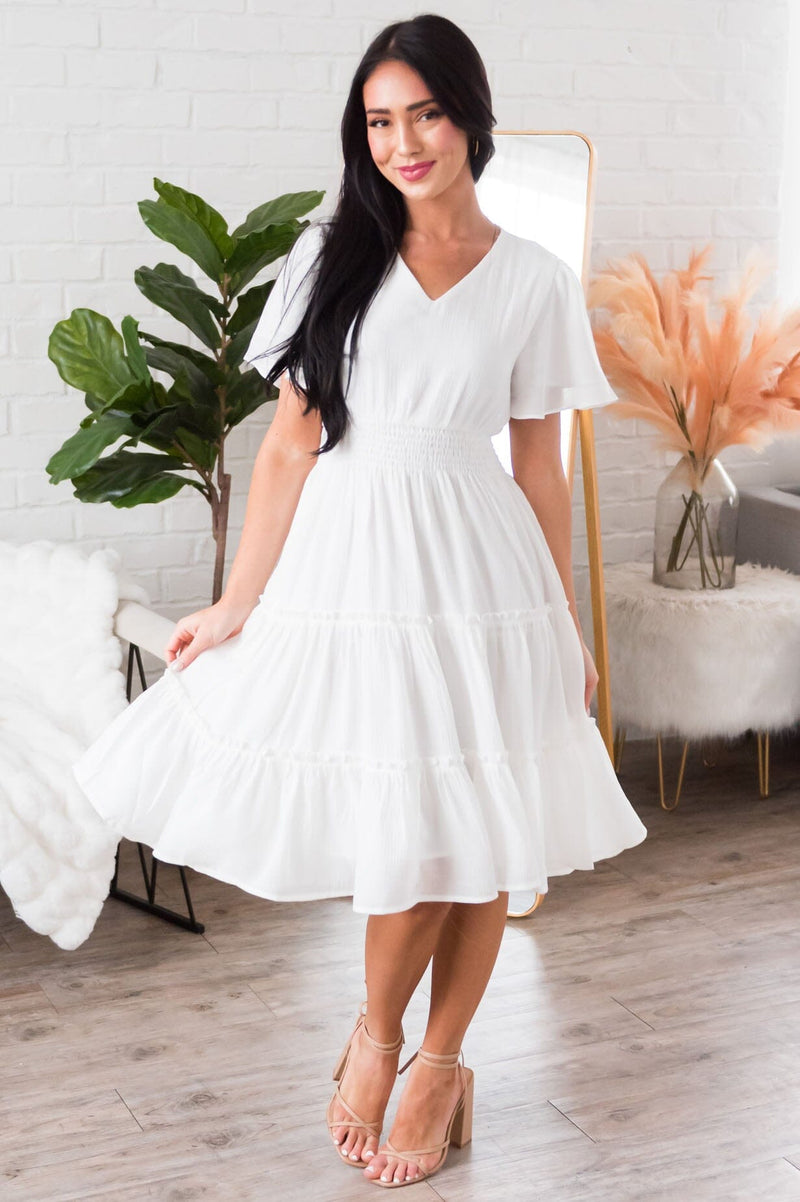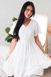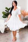 The lovely flowy Tate is a must have for your Spring wardrobe! We love the short flutter sleeves, soft v-neckline, flattering smocked waistline and flowy tiered mid-length dress. Get yours today!