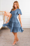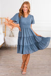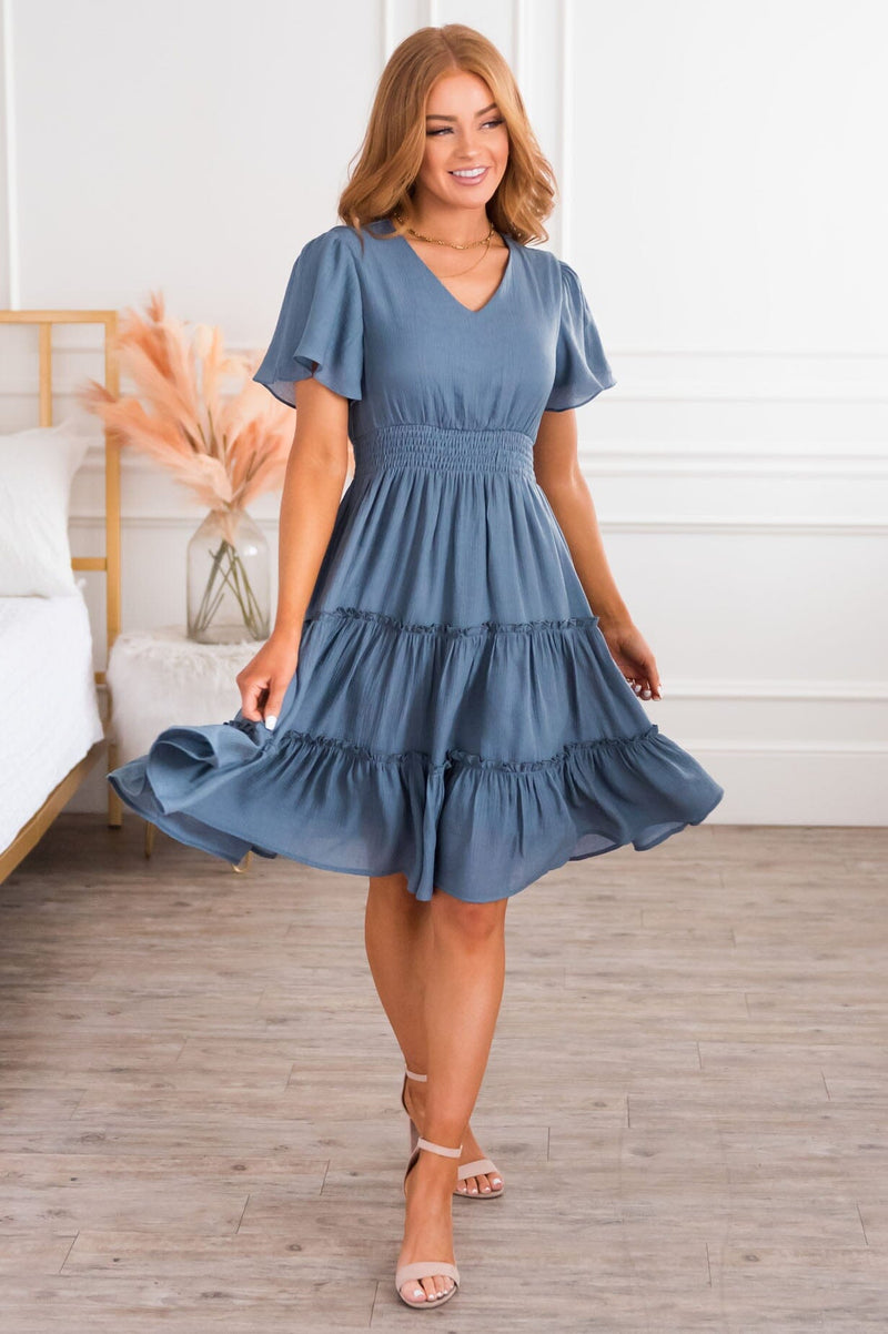 The lovely flowy Tate is a must have for your Spring wardrobe! We love the short flutter sleeves, soft v-neckline, flattering smocked waistline and flowy tiered mid-length dress. Get yours today!