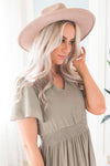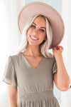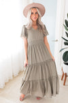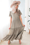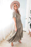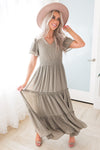 Our new Taylor is simply elegance at its best! With gorgeous features such as the modest v-neckline, shirred elastic waistband, tiered ruffle detailing on the maxi skirt, and the stunning light olive green color; you're sure to turn heads wherever you go! This darling dress has stolen our hearts, make sure to get one before they're gone!