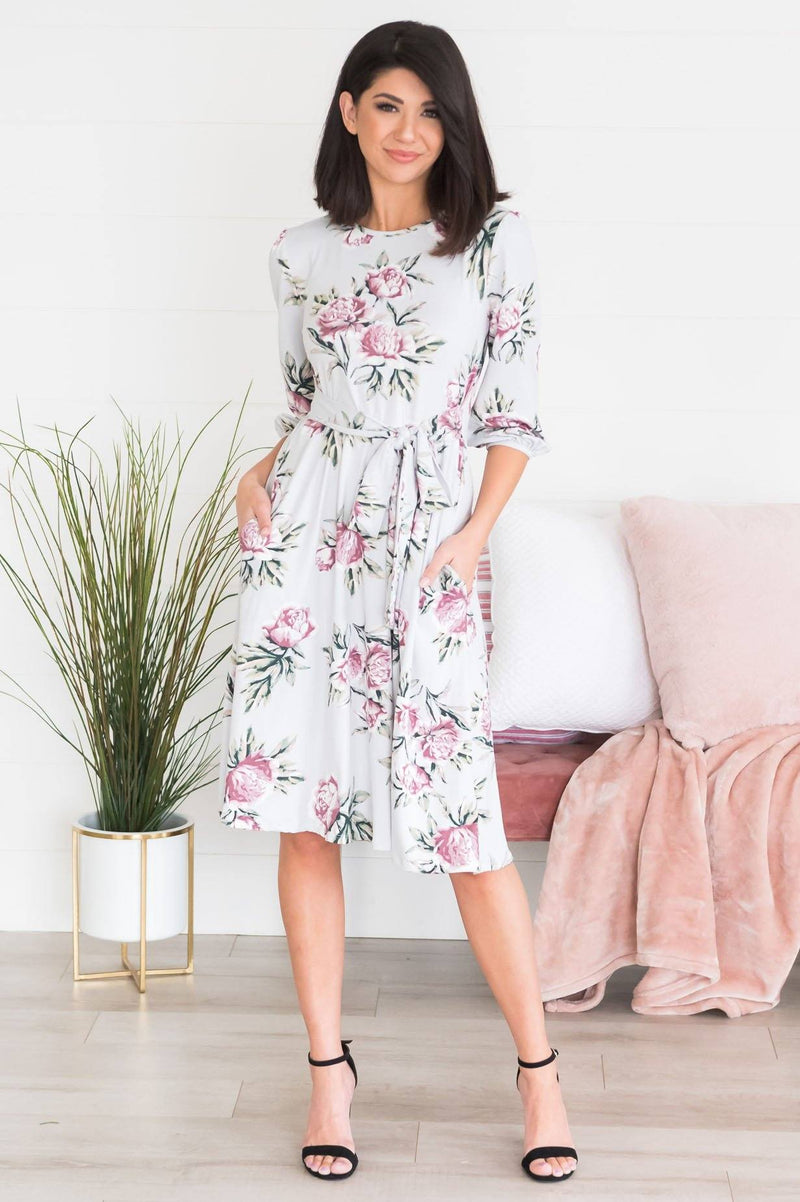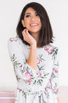 This simply perfect dress will be nothing, but darling on you! This beautiful floral pattern will definitely be a bonus to any wardrobe! We are so excited for the quarter sleeve length and tie waist on this Taysen!