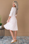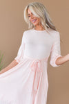 The new Taysen dress will be nothing but darling on you! The beautiful dainty white floral contrast the peachy pink so beautifully. The most buttery soft fabric you'll ever want! Gorgeous addition to any wardrobe! We are in love with the quarter length sleeves with an elastic band hem, elastic waist band with a belt tie, pockets, and a perfect modest length skirt!