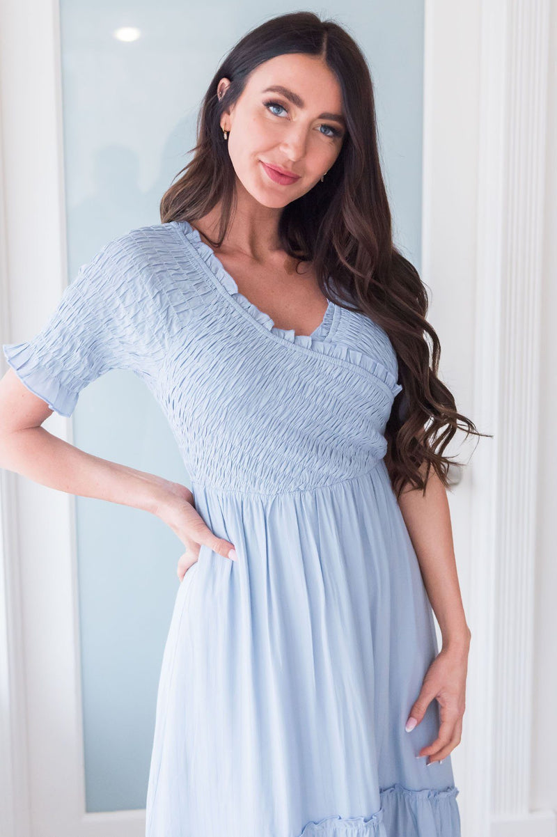 We are obsessed with the Tegan's sky blue color and ruffled details! The smocked soft V-neck and tiered ruffle high low skirt will steal your heart like it did ours! This flowy and beaming gown is a show stopper!