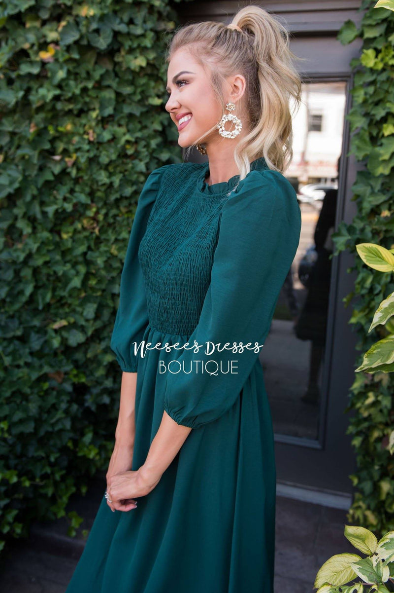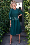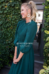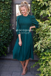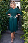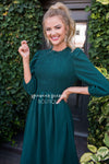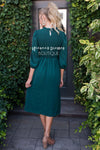 Our new Teja dress is seriously perfection! We are loving the high Victorian neck line with ruffle detailing, it adds the perfect touch for any occasion. The shirred detailed bodice plus the puffy 3/4 length sleeves paired with this stunning shade of hunter green creates such a classic timeless look. Add the perfect pair of booties and your favorite accessories to create a statement look! This dress is also lined.
