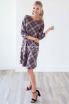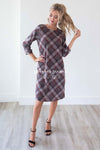 When simple meets cute!This comfortable and flattering swing dress features a rust and gray plaid print, 3/4 length sleeves and a round neckline. Unlined and has stretch.