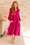 Taking in all the frills with the gorgeous new Tereze! Featuring lovely textured magenta fabric, flowy tiered skirt, v-neckline with a functional button front,pockets and perfectly matched long sleeves. I don't even think we have to tell you to add this one to your cart now! It will not last long!