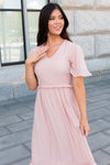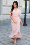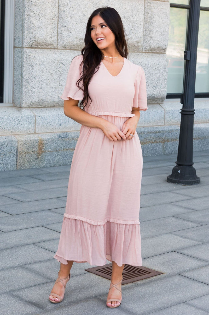 Our new Tess dress is absolutely stunning in every way! This dress features; gorgeous flutter short sleeves, modest V-neck, elastic ruffle waistline that gives this beauty some stretch, tiered hem line, relaxed tea length skirt. This drees is so classy and elegant you will instantly fall in love with it!
