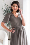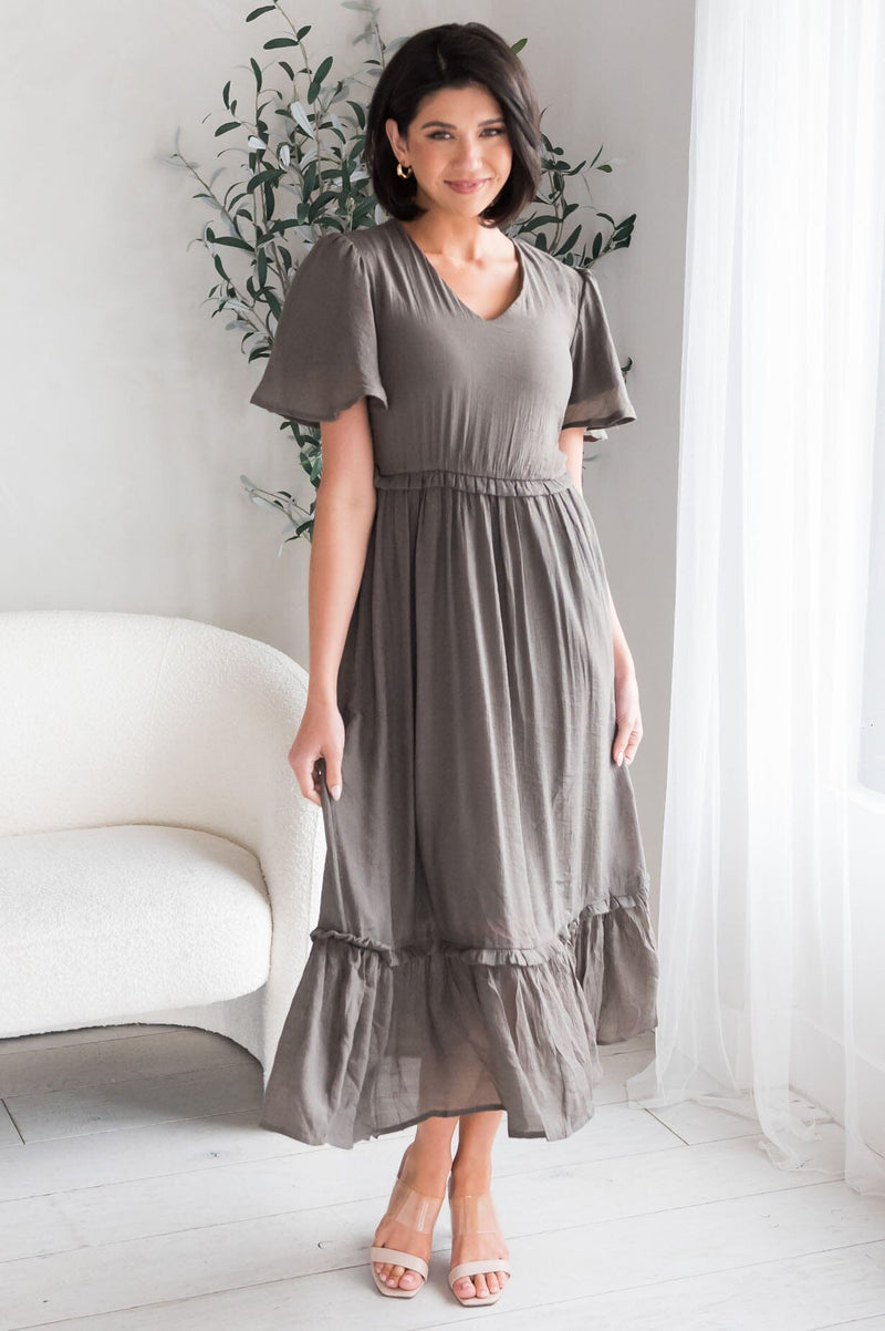 Our new Tess dress is absolutely stunning in every way! This dress features; gorgeous flutter short sleeves, modest V-neck, elastic ruffle waistline that gives this beauty some stretch, tiered hem line, relaxed tea length skirt. This drees is so classy and elegant you will instantly fall in love with it!
