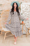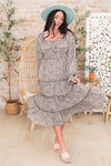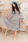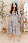 Our new Theo dress is absolutely stunning in every way! This dress features gorgeous long puff sleeves, modest squared neckline with darling feminine tie detail, elastic ruffle waistline that gives this beauty some stretch, & tiered maxi skirt. This dress is so classy and elegant you will instantly fall in love with it!