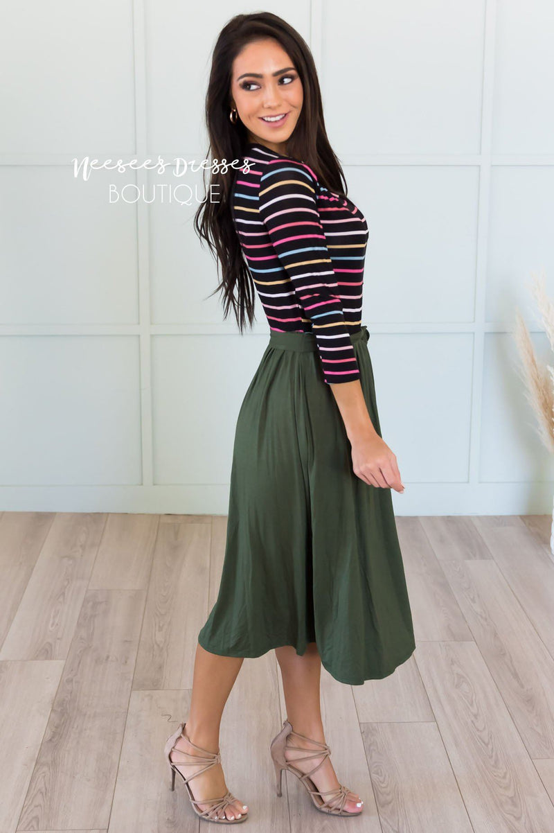Been on the search for the perfect fall dress? This striped beauty is it, get your Tiana before they are all gone! Featuring a cozy soft material, fun striped bodice with 3/4 length sleeves, belt tie waist and a gorgeous flowy skirt!