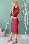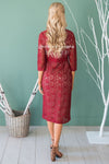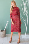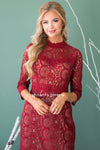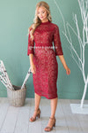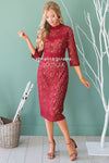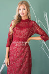 The Tilde is the perfect dress for all your holiday occasion! The contrast from the nude lining compared to the burgundy lace over lay is absolutely stunning, it creates the perfect classic look. Features a fitted pencil fit, a high neck line, half length sleeves and a knee length skirt. This dress is also fully lined and has a back zipper closure.