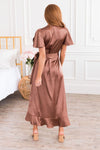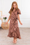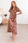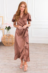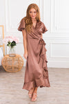 Our Tina Marie dress is the most beautiful new dress. This lovely, modest, satin, dress features the most elegant ruffled details! We love the crossover bodice, ruffled-wrap high-low skirt, and flattering short flutter sleeves!