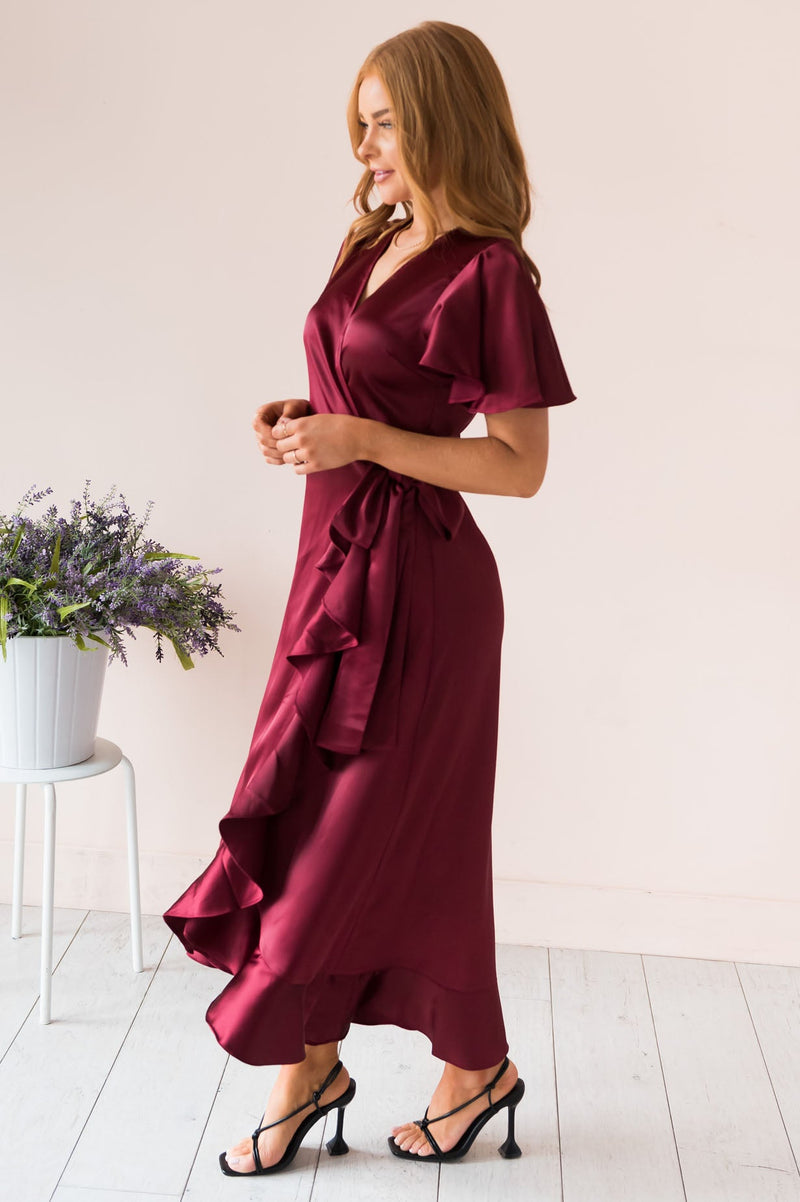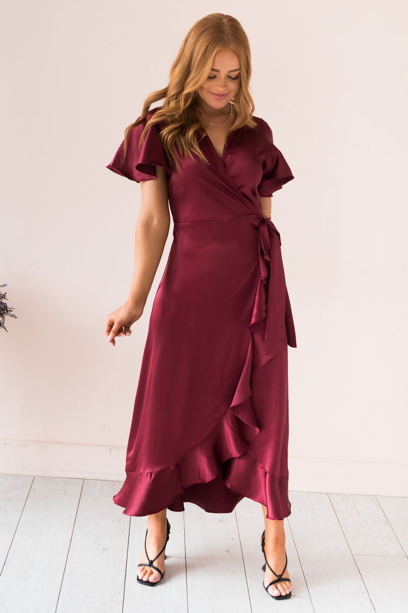 Our Tina Marie dress is the perfect floral to take to from Summer to Fall! This lovely modest satin dress features the most elegant ruffled details! We love the crossover bodice, ruffled wrap high-low skirt and flattering short flutter sleeves! Trust us when we say, add to cart now!