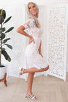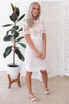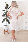 We are simply in love with our New Tinelle dress! This darling lace overlay dress is so delicate and perfect for anything life throws your way! Featuring a lovely modest high neckline, half length unlined sleeves, back zipper closure and a gorgeous pencil fit lace skirt.