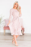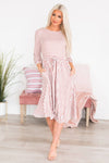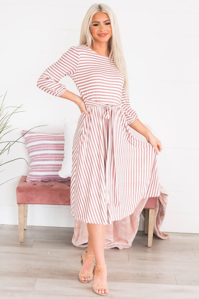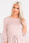 This simply perfect dress will be nothing but darling on you! This dress is a gorgeous mauve pink color, and the ivory stripes make it so much better! We are so excited for the quarter sleeve length and tie waist on this Tinley!