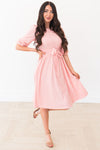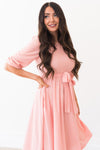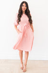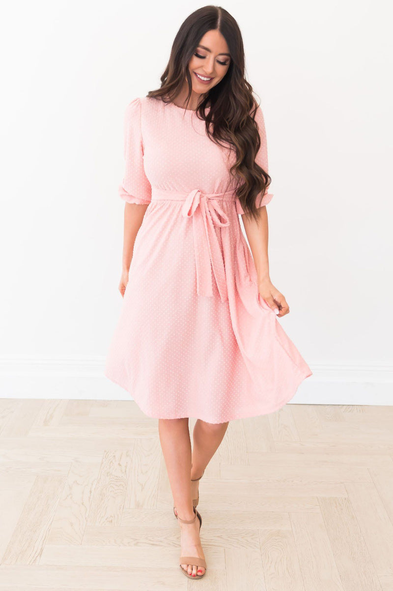 This simply perfect dress will be nothing, but darling on you! This beautiful pink peach and swiss dot design is definitely a bonus to any wardrobe! We are so excited for the quarter sleeve length and tie waist on this Tinley!