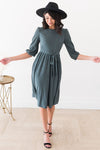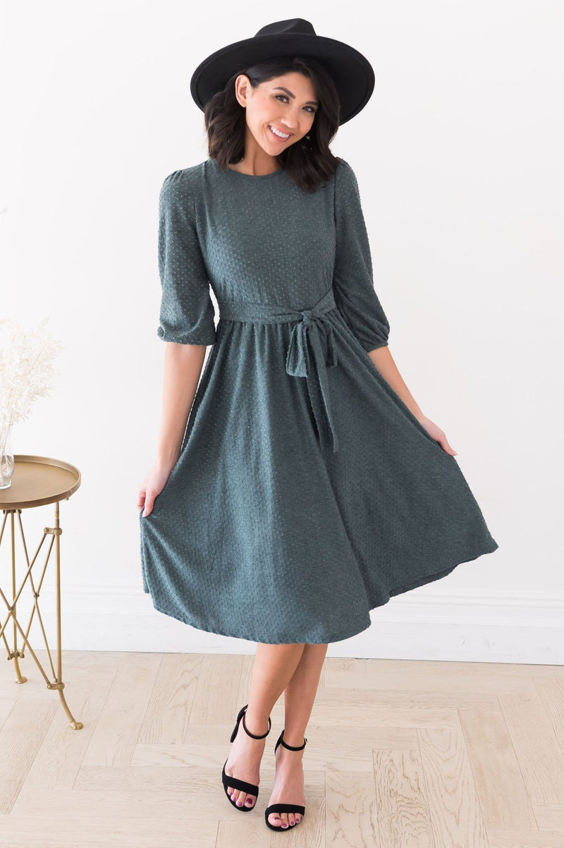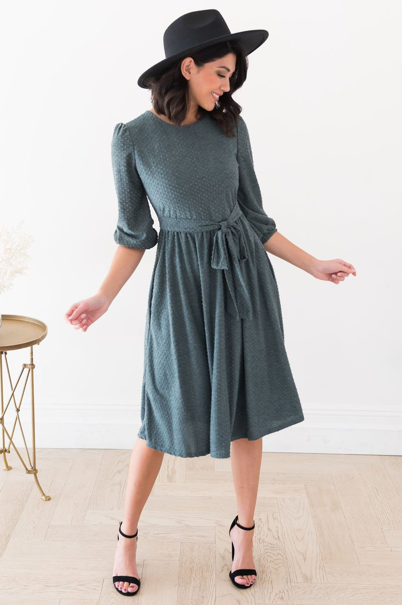 This beautiful charcoal grey dress with swiss dot design is definitely a bonus to any wardrobe! We are so excited for the quarter sleeve length and tie waist on this Tinley! This simply gorgeous dress will be nothing but darling on you!