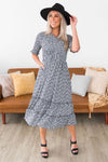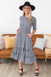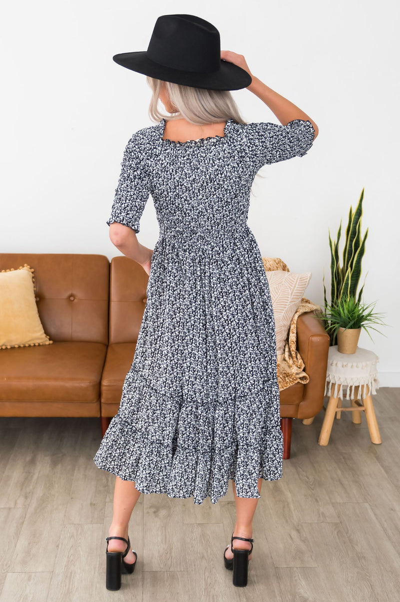 This dress if full of all the sweetest details! The smocked cross-over bodice is perfect for all you nursing mama's out there! It's the perfect stylish functional piece for everyone! Features include half length, fitted sleeves, pockets and the perfect tea-length ruffle tiered skirt!