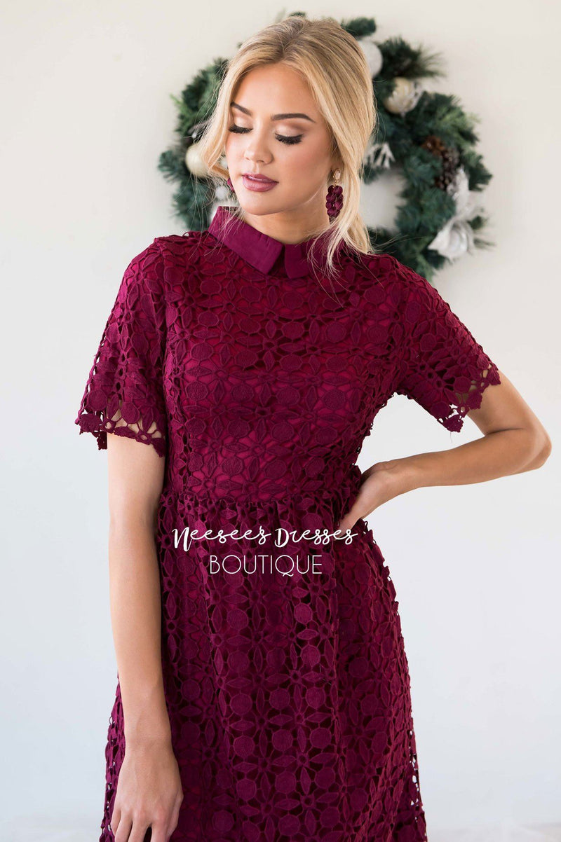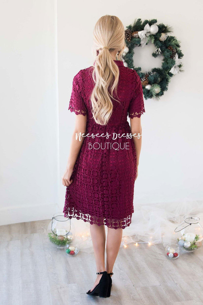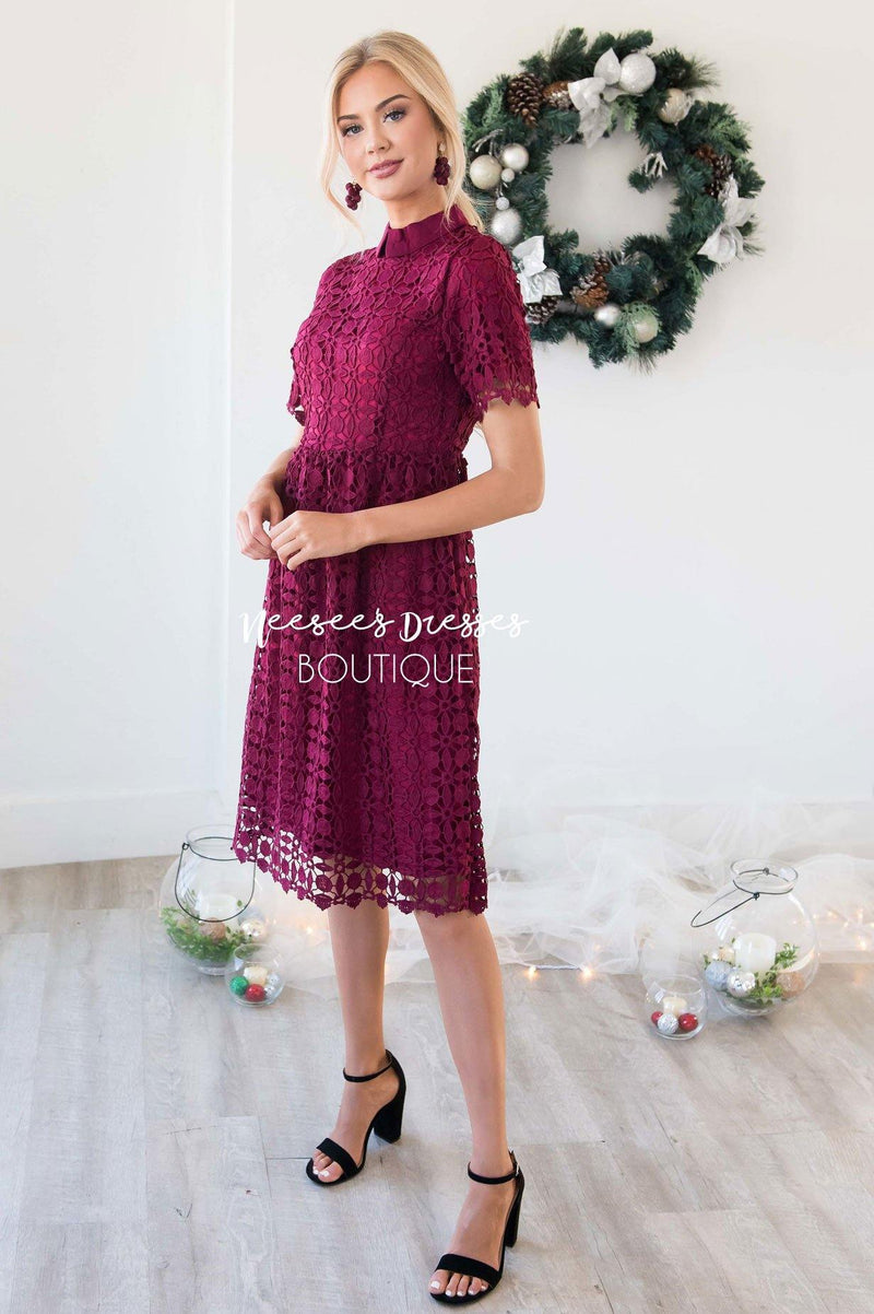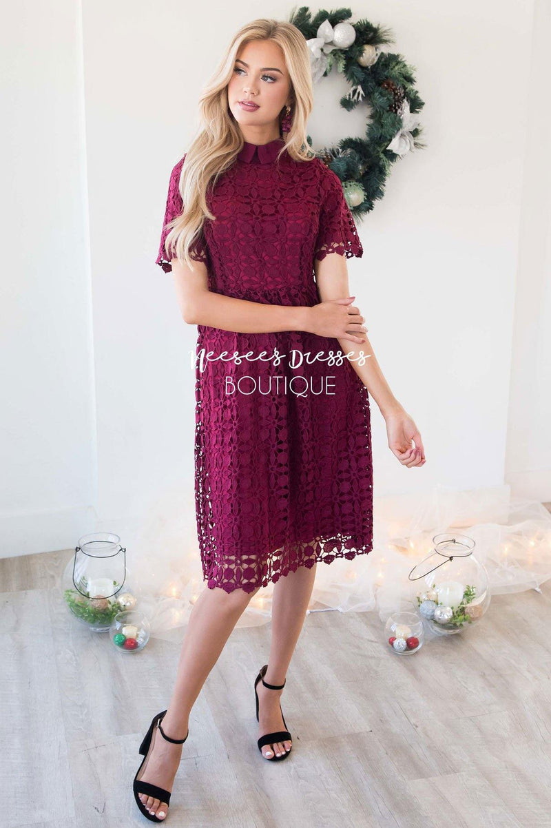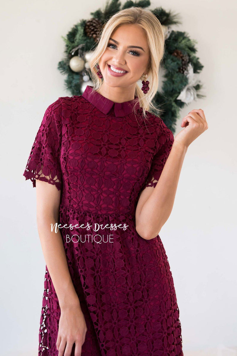 Meet our new Trinity lace dress! This dress is must have for all your holiday parties! Beautiful deep burgundy lace dress features the cutest high collar neckline, a gathered waits, lace trim hem and is fully lined with a back zipper closure.