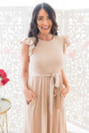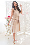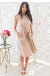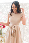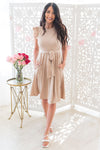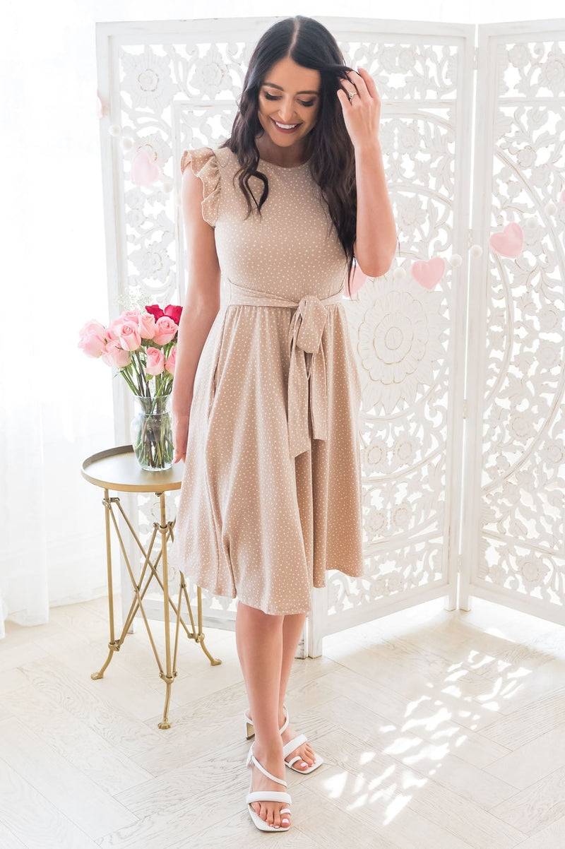 This simply perfect dress will be nothing but darling on you! This beautiful taupe/ivory ribbed dress with a gorgeous mini polka dot design is definitely a bonus to any wardrobe! We love the short flutter sleeves and tie waist on this Trinley!