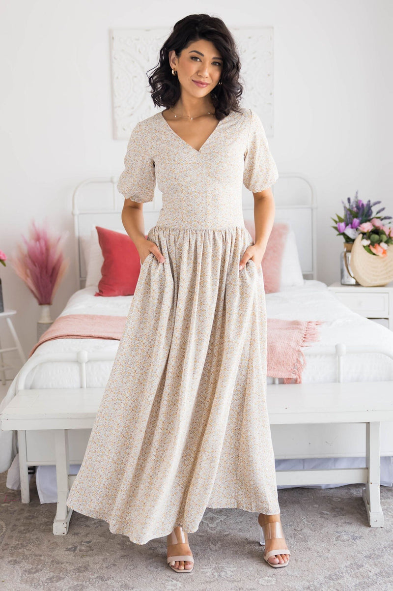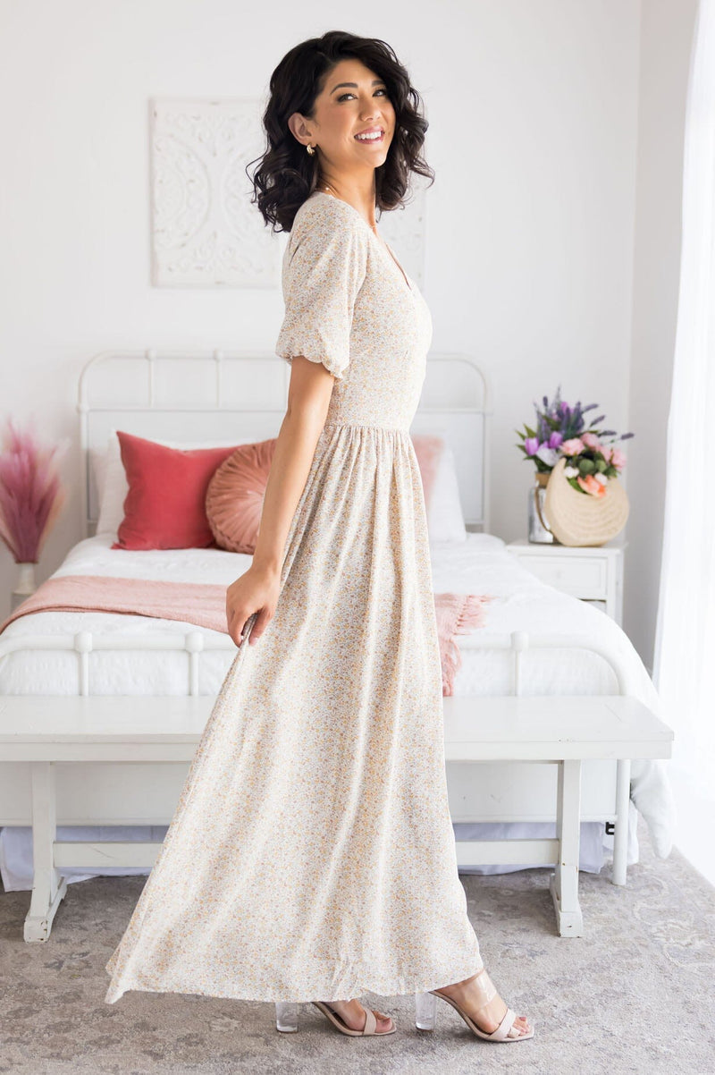 The Tristin is the dress fairytales are made for! This lovely modest floral has a soft v-neckline, short sleeves, banded waistline with, zipper back closure and twirl worthy skirt. Grab yours today!