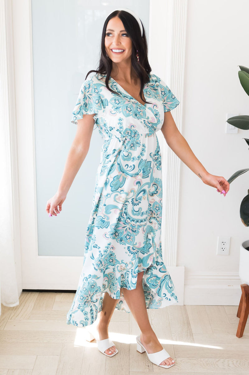 The Trixi is one gorgeous modest floral! Trust us when we say you are going to want to add to cart now because this darling dress will sell out quickly! Features include lovely floral paisley print, short sleeves and a high-low ruffle skirt.
