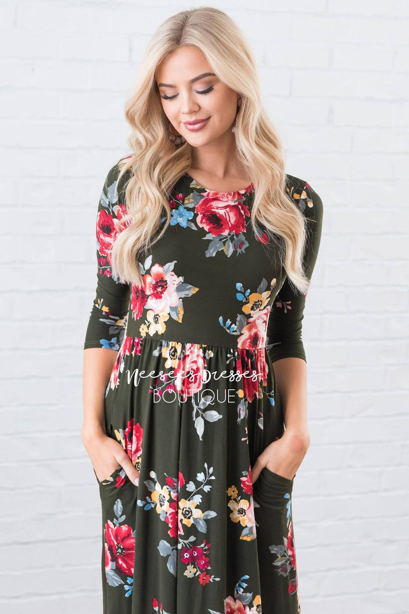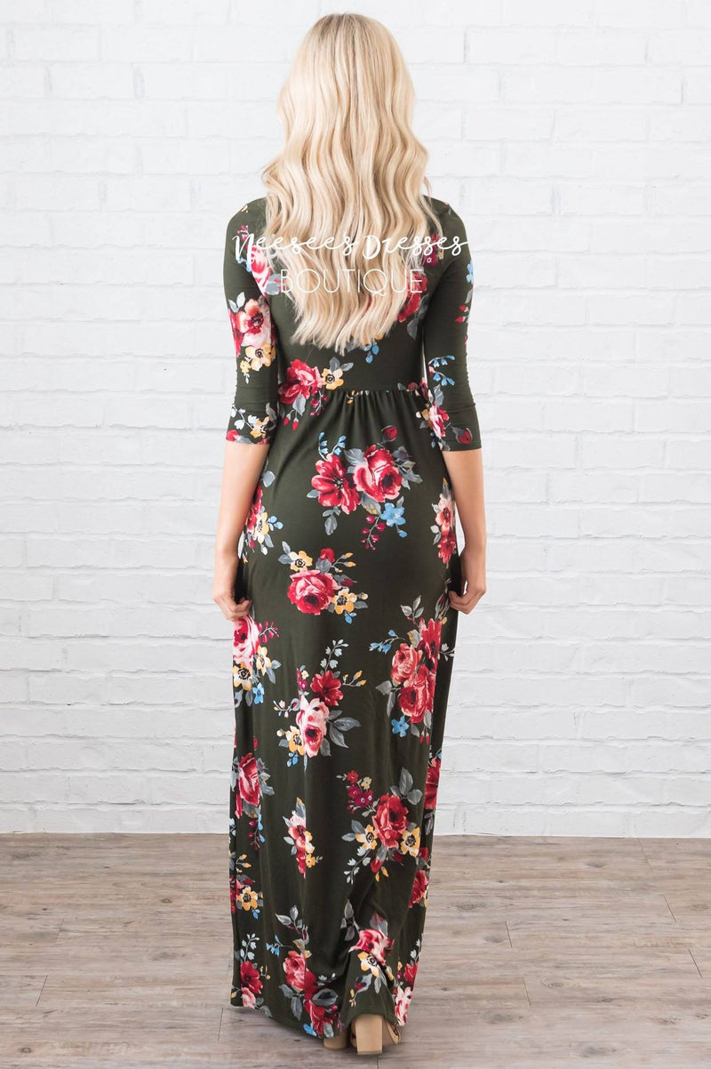 This modest beauty checks all the boxes! Soft, classy, perfect for any occasion! Get yourself the Tyra today! Maxi dress features as always, modest length in a gorgeous flowy skirt, round neckline, fitted bodice & 3/4 length sleeves. Simply our new favorite floral!