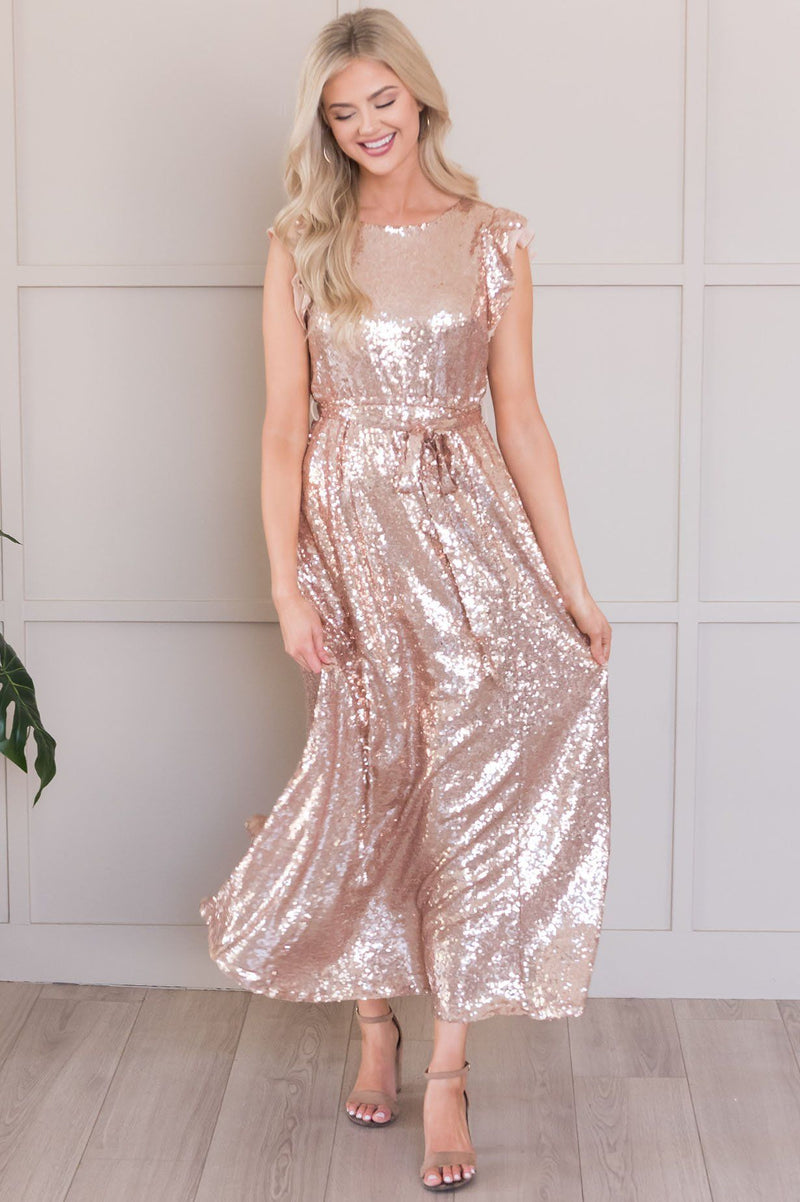 This is one dress you will not want to miss out on! The glistening sequin gown is sure to be unforgettable! We are just captivated by the stunning modest fit, fabulous short ruffle cap sleeves, and the ravishing free flowing maxi skirt! How absolutely dazzling!
