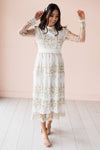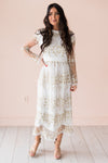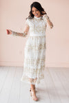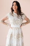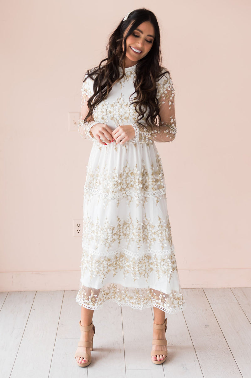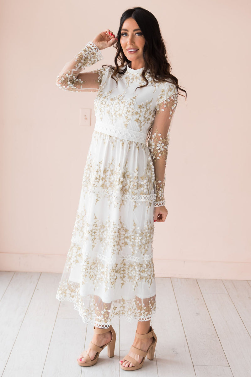 We are simply in love with our New Valeriya dress! This darling lace overlay dress is so delicate and perfect for anything life throws your way! Featuring a lovely modest high neckline, long unlined sleeves, back zipper closure and a gorgeous tiered lace skirt.