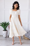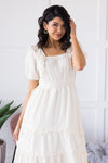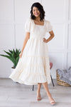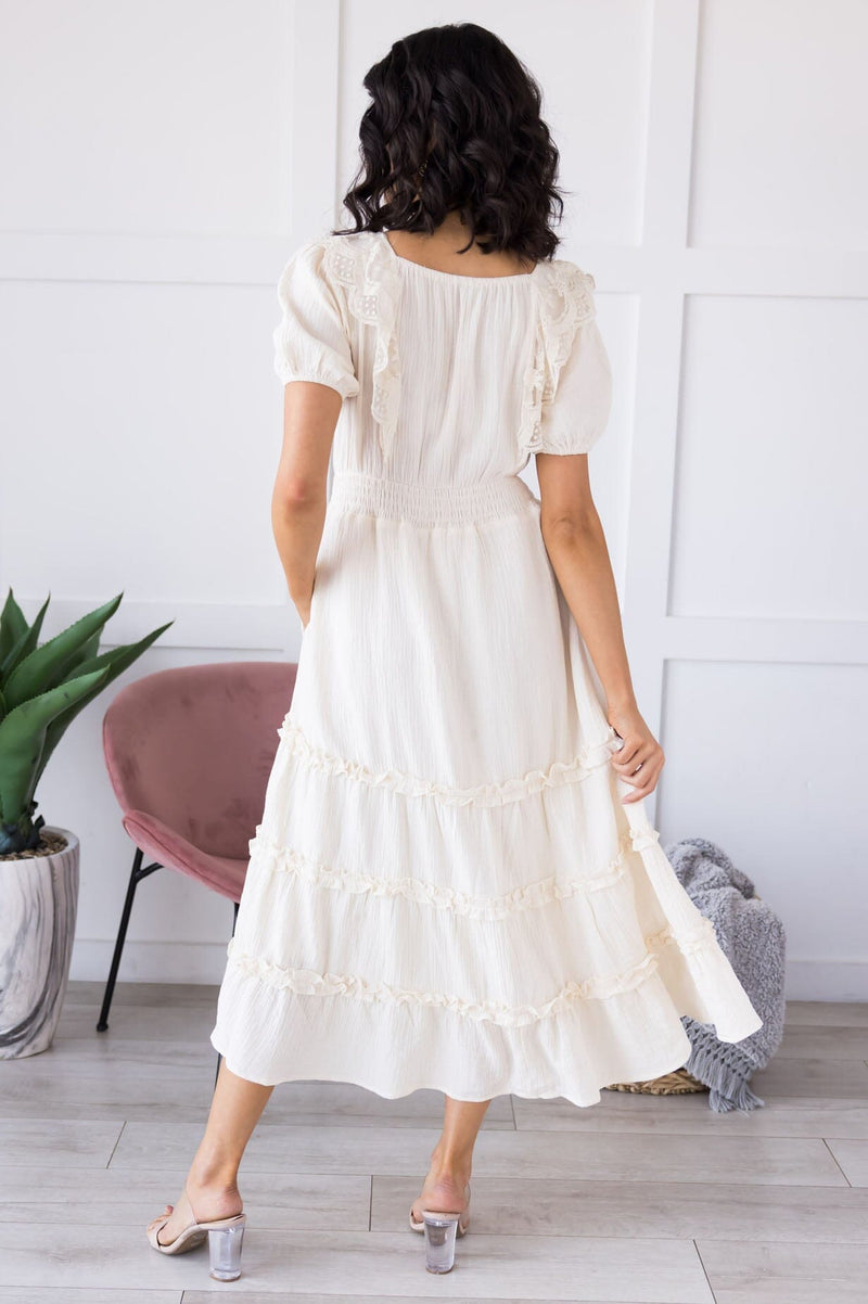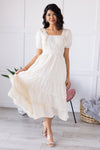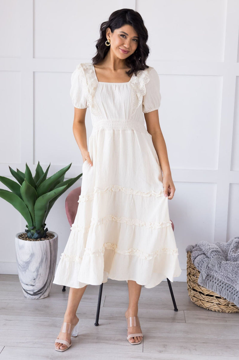 If this dress left you speechless, you aren't alone! We cannot stop swooning over our new, modest, Vienna dress. This white gauze beauty features a squared neckline with delicate ruffled lace detailing, smocked waistline, pretty puff sleeves, and twirl worthy skirt ruffle tiered skirt. Get yours today!