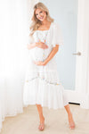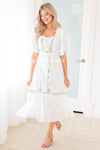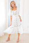 Embroidered floral bliss! Loving the New Vikki dress! Flowy ruffle empire style dress, lined lightweight material with the loveliest floral embroidery in blue, coral, purple, mustard and green colors. Perfect dress or any occasion, feminine, flowy modest dream come true!
