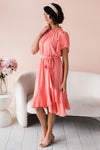 Be the prettiest in coral as can be with the new Vivi! This gorgeous mid-length dress features a modest ruffled neckline, short cross flutter sleeves, cozy soft stretch material, belt tie waist, and last but not least the darling faux wrap skirt! These will go quick, get yours before they are gone!
