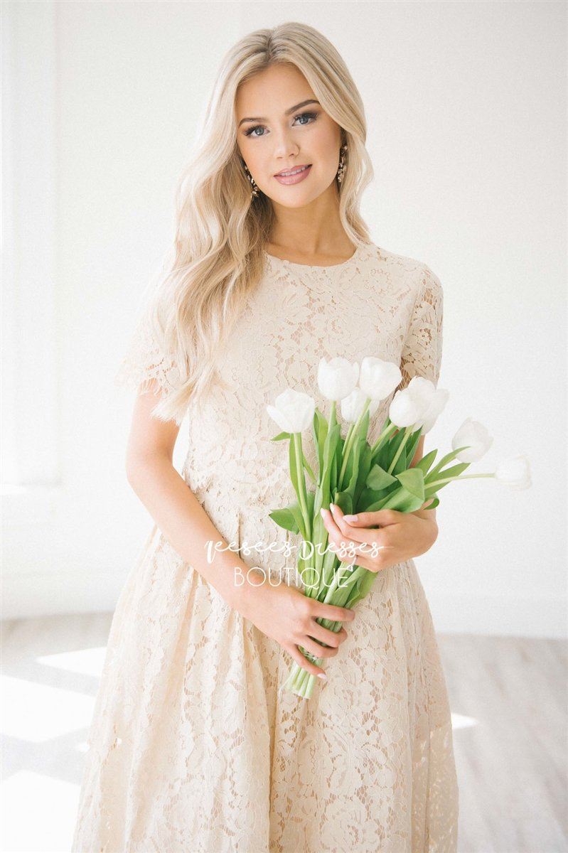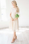 We are beyond in love with the breathtaking and stunning new dress! This dress gives the illusion of a top and skirt but it is one full piece that is fully lined. Beautiful cream lace dress features short scalloped lace sleeves, a natural waist, a full pleated skirt with a scalloped hem with a perfect a line fit!