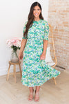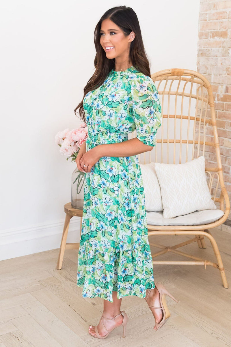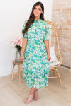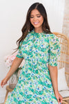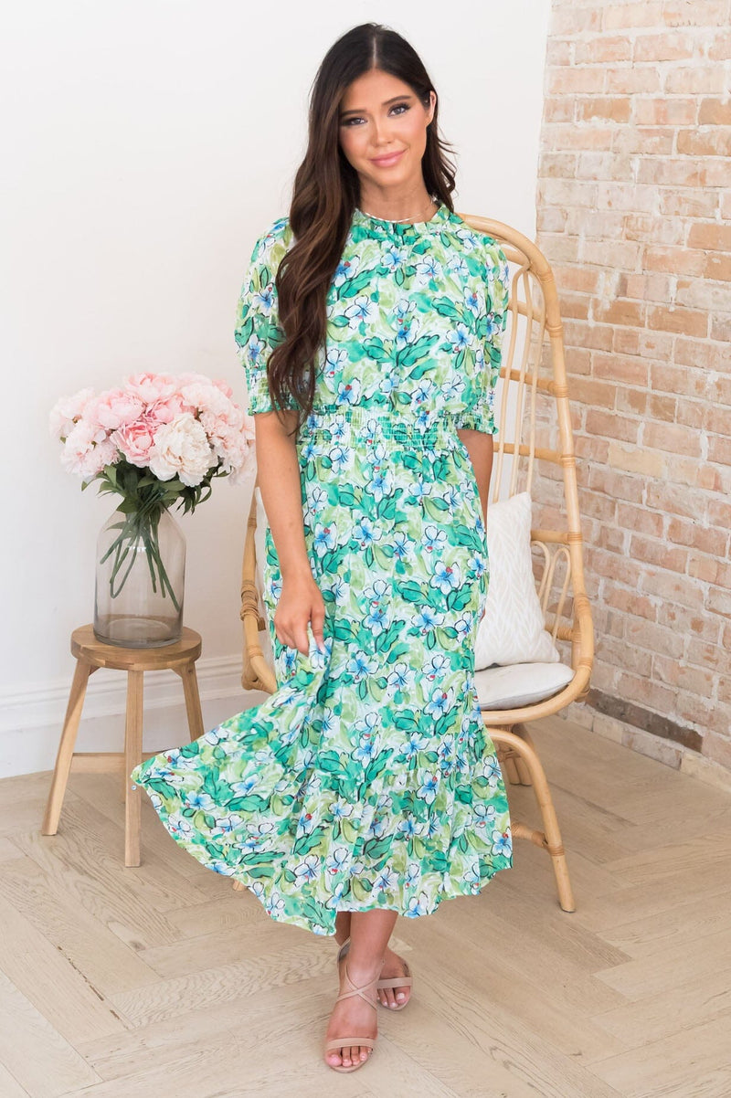 A fresh new look has arrived and the darling Whitmore is bound to be a hit, featuring half length puff sleeves, smocked elastic waistline and a feminine flowy ruffle hem skirt. Not to mention the most feminine green floral print! Get yours today!