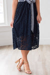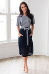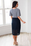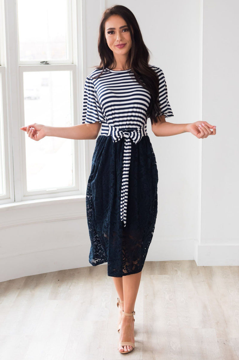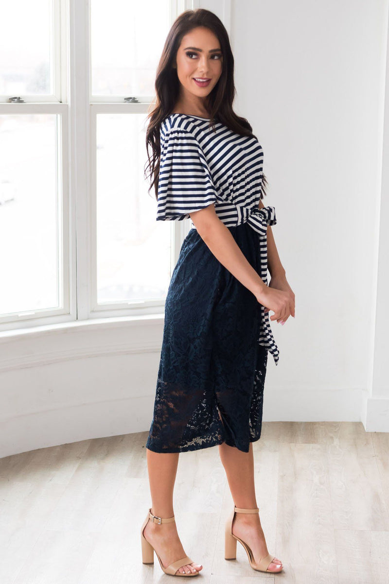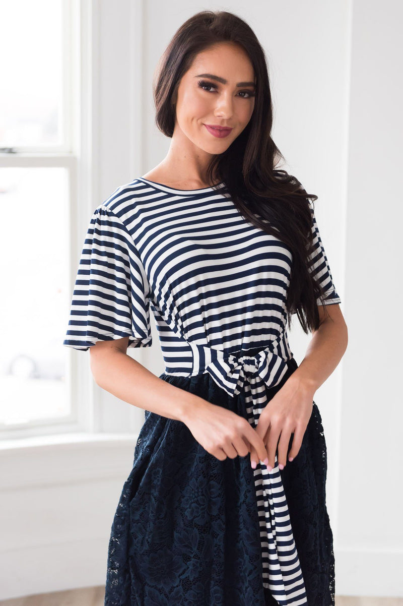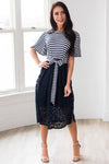 The new Whitney is bound to be a hit, trust us you will not want to wait on this feminine beauty! Featuring elegant striped bodice with short flutter sleeves, belt tie waist and a beloved lace skirt. This gorgeous dress will not last long!