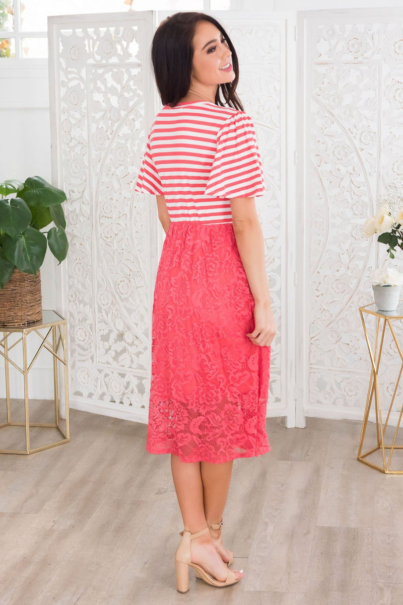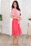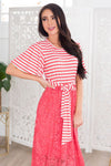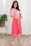 The new Whitney is bound to be a hit, trust us you will not want to wait on this feminine beauty! Featuring elegant striped bodice with short flutter sleeves, belt tie waist and a beloved lace skirt. This gorgeous dress will not last long!