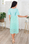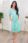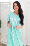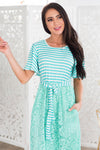 The new Whitney is bound to be a hit, trust us you will not want to wait on this feminine beauty! Featuring elegant striped bodice with short flutter sleeves, belt tie waist and a beloved lace skirt. This gorgeous dress will not last long!