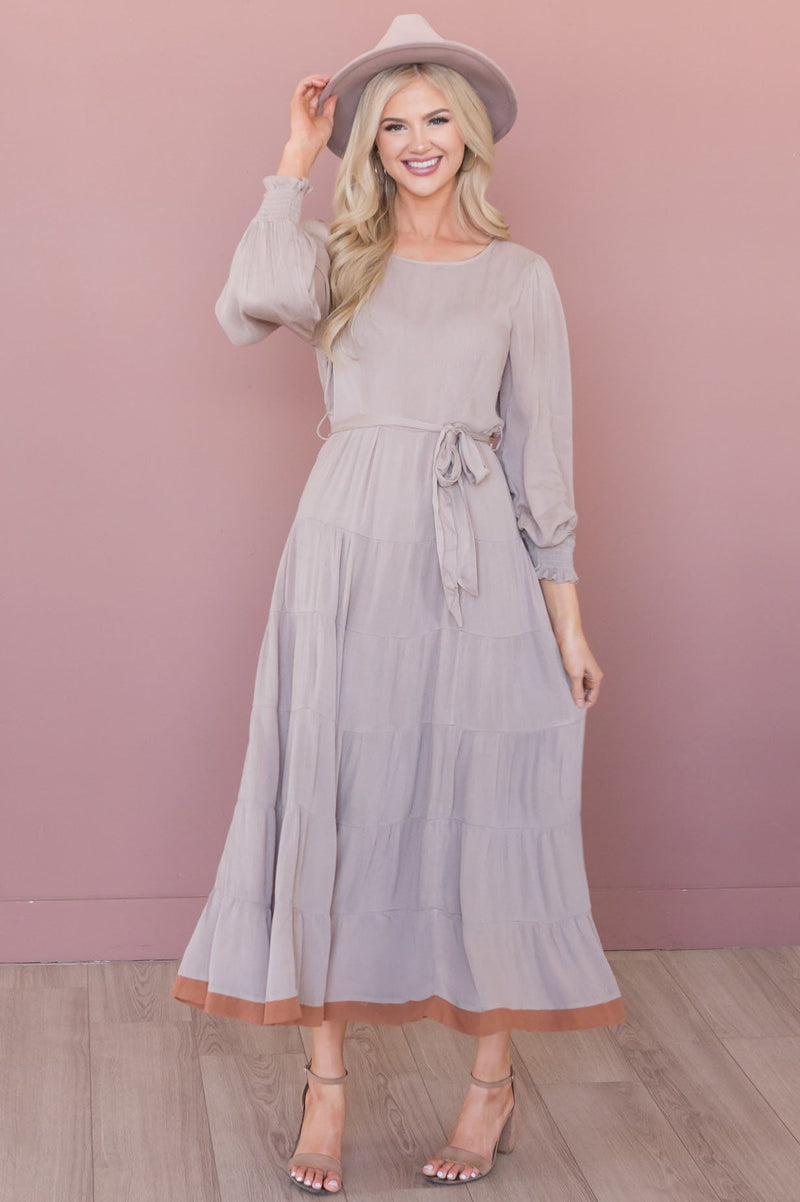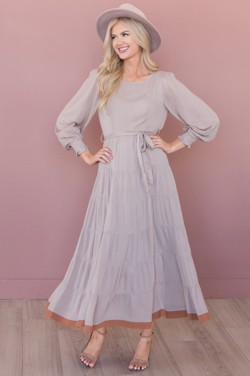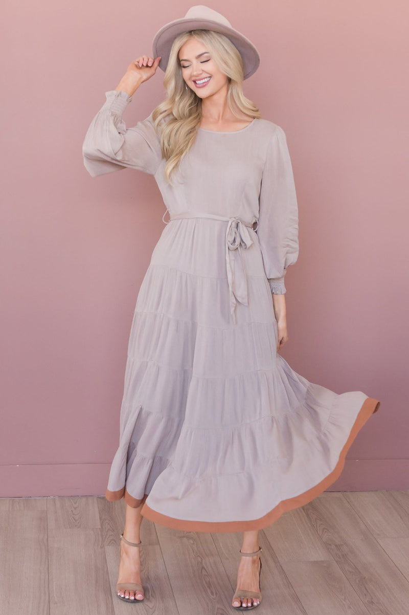 The Willah is just as simple, yet beautiful as it's name! The delicately tiered skirt and small copper hemline stripe is just graceful beyond measure! And get a look at those absolutely fabulous and feminine thick cuffed sleeves with ruffle detailing!