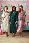 The gorgeous little Wimslow is bound to steal your heart! The lovely shimmery organza fabric is so eye catching and classy! This dress is perfect for any season and any event! Featuring a wrap style sweetheart neckline, short puff sleeves and perfect length ruffle hem skirt. Get this elegant beauty today!