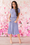 The Winnie dress is one you are going to want to join your wardrobe! This modest solid color beauty is made out of the softest ever material! Featuring a rounded neckline, short sleeves, elastic waist, pockets and the perfect modest mid-length! Get yours today!