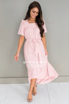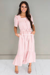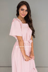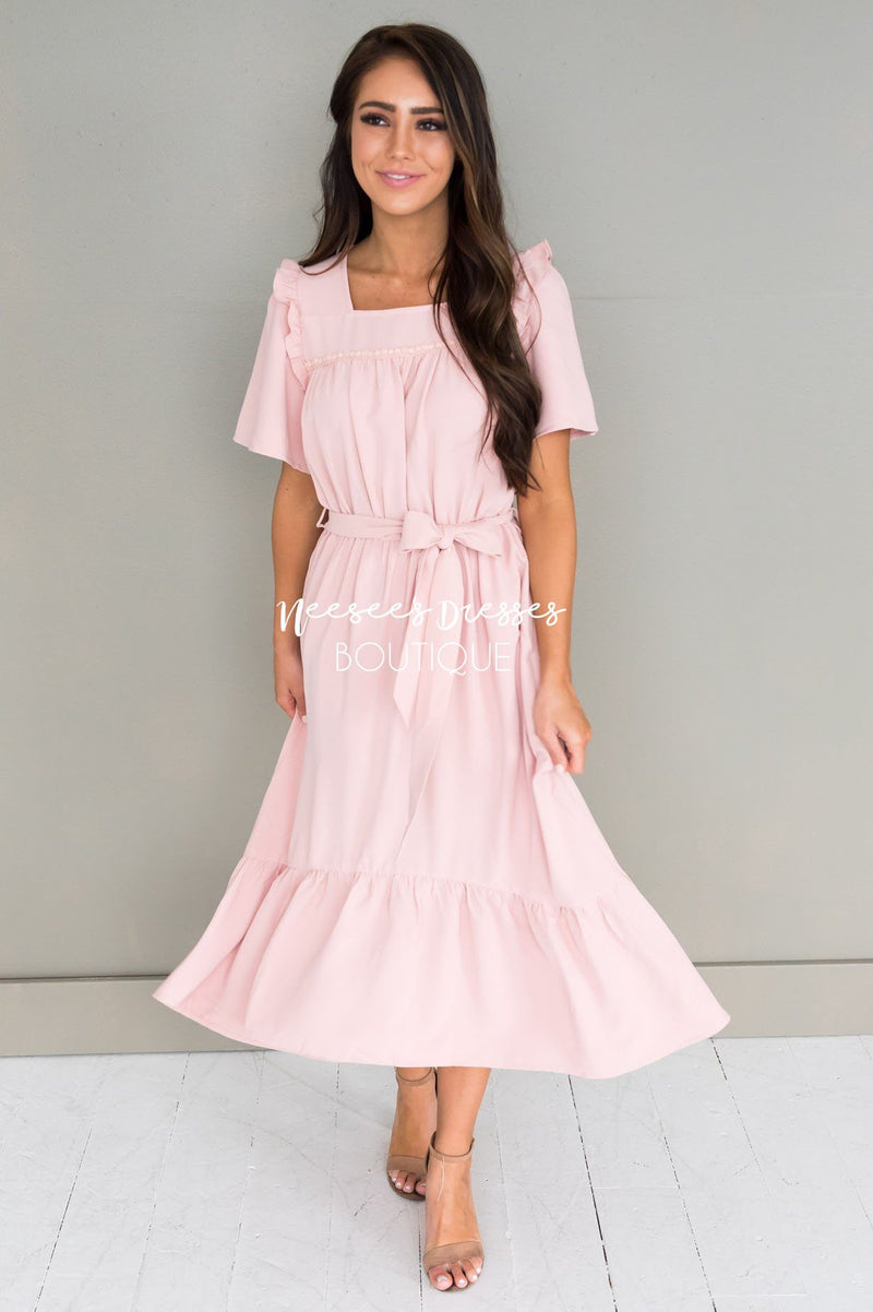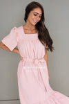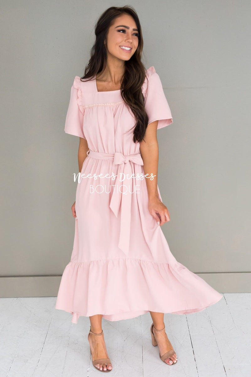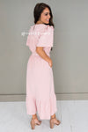 The lovely Winona has stolen our hearts! Featuring so many delicate feminine details, floral lace bodice edging, short ruffle shoulder sleeves, elastic waist with belt tie and our favorite feature, the modest high-low double ruffle hemline! Get yours today!