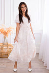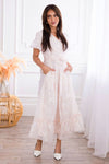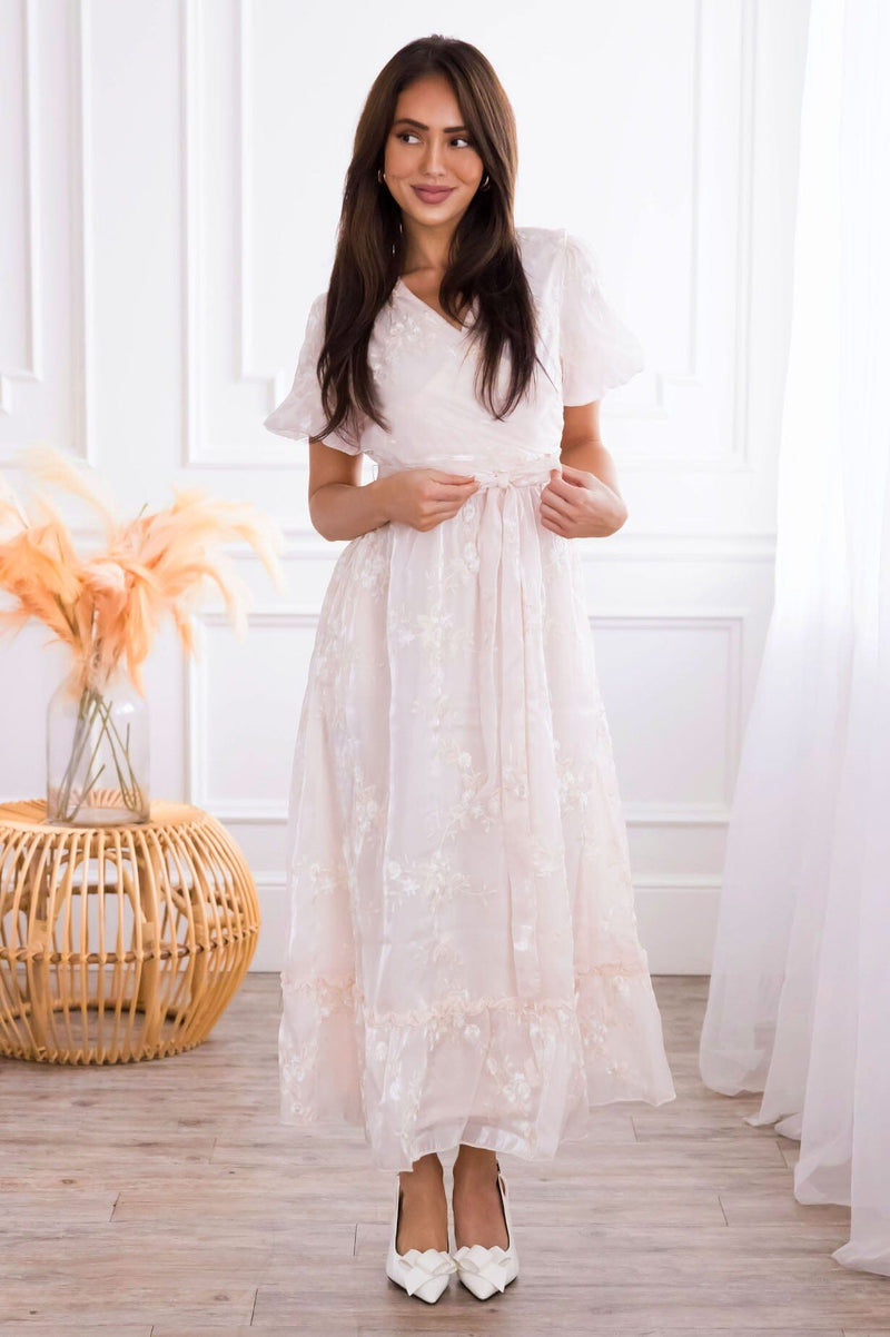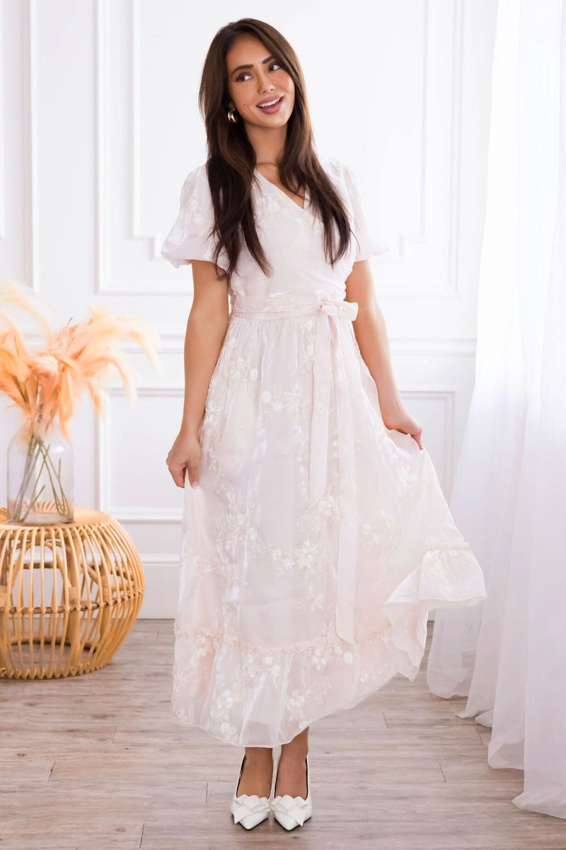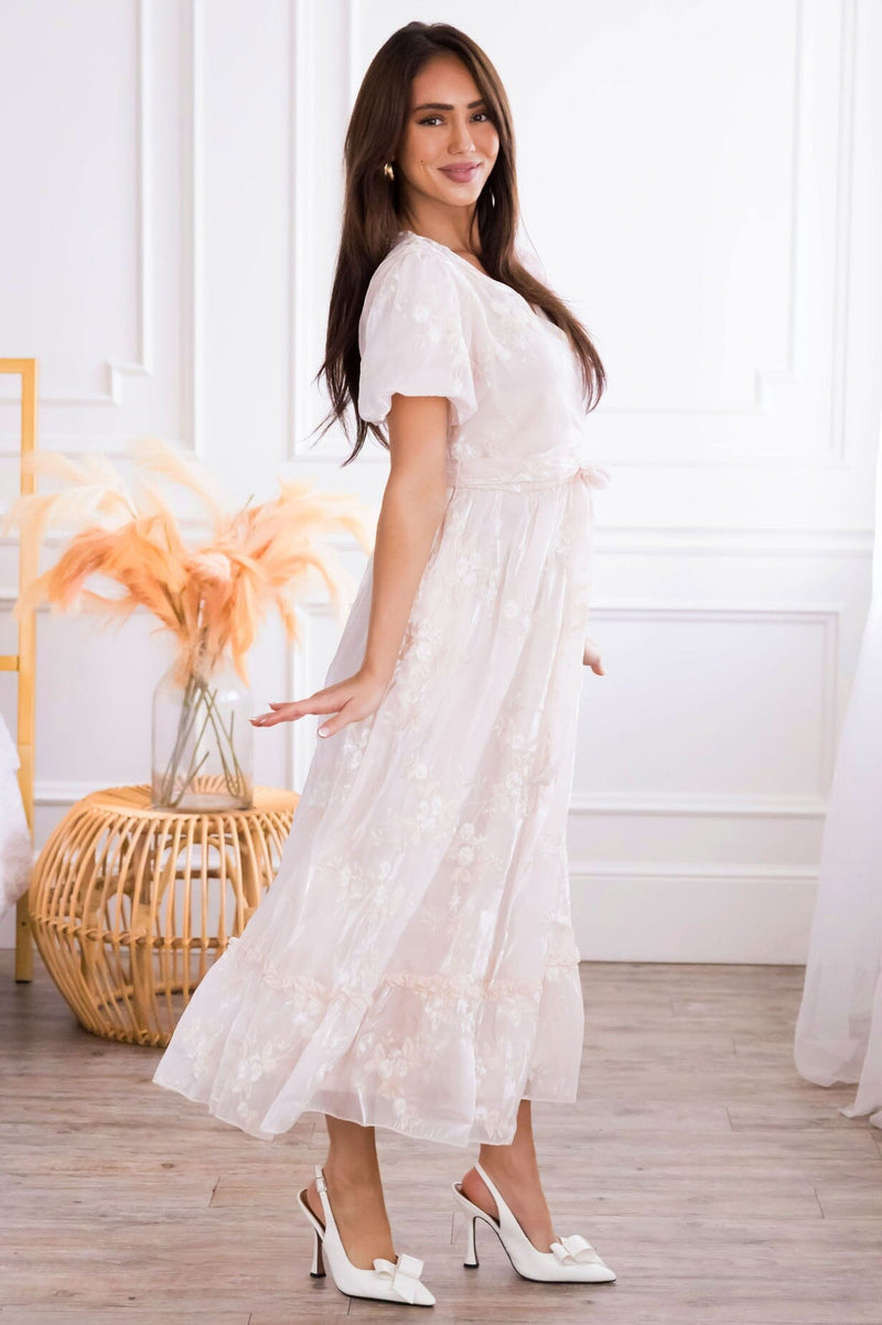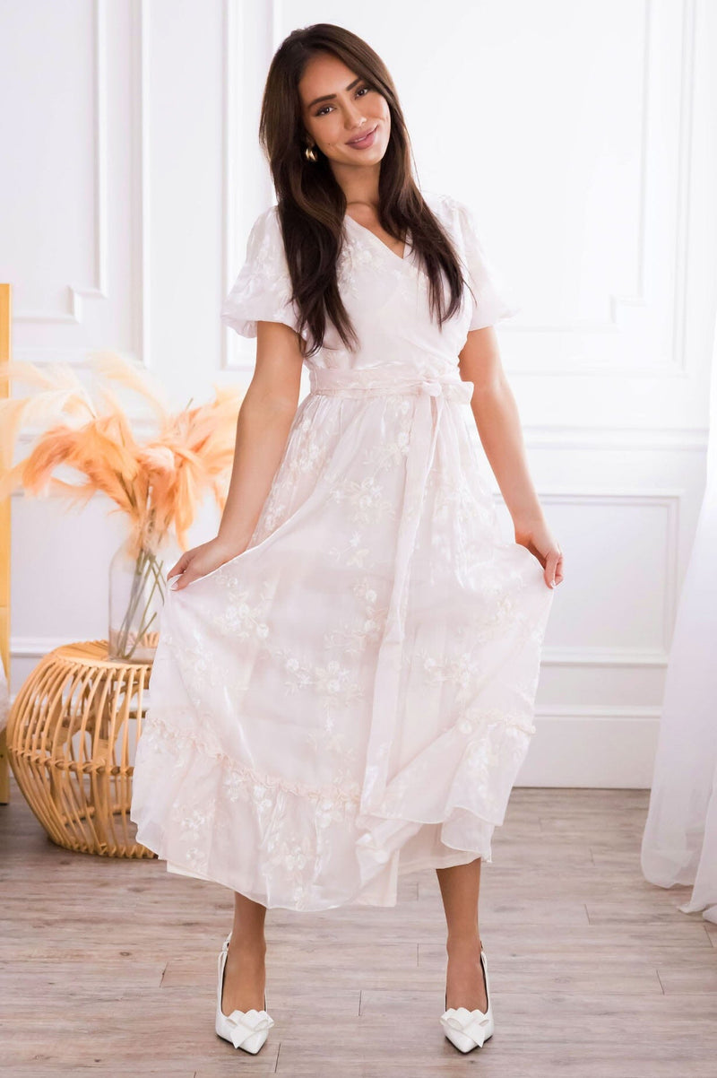 The Winslet is a fairytale dream of a dress! This lovely feminine taffeta embroidered beauty is something we thought we would only see in our dreams, be sure to get your fast, these will not last long! Featuring a modest crossover neckline, belt tie waistline, pockets and a twirl worthy skirt!