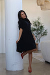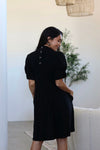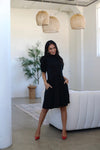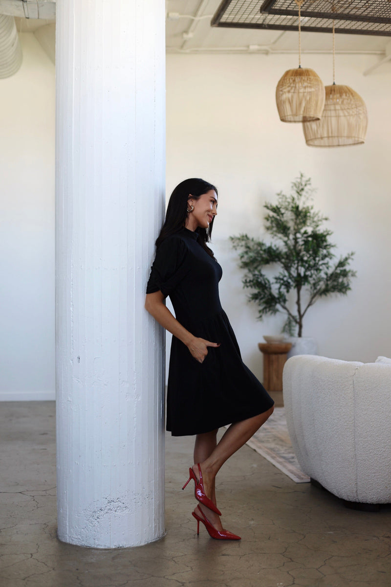 The Xanthe is a breathe of fresh air! This lovely perfect for everything little black dress is an add to cart now kind of dress! Featuring cozy stretch fabric, modest mock neckline, half length ruched sleeves, pockets, perfect length skirt and button back closure.