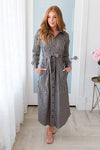 We instantly fell in love with our classy, modest, Yvaine Dress. This collared dress features long sleeves, a button front (ideal for nursing mothers), a waist tie, pockets, and flattering, contrasting, vertical stripes.