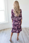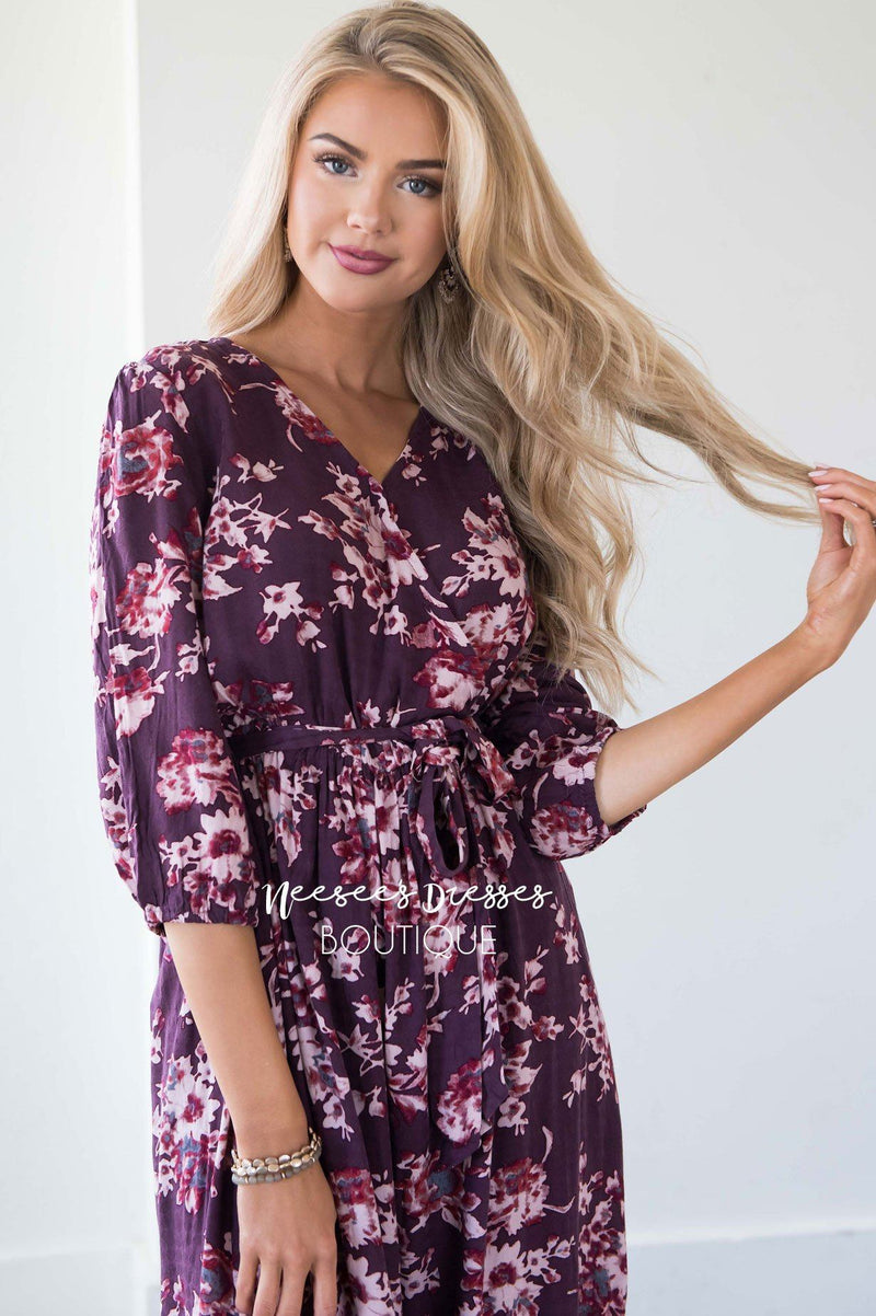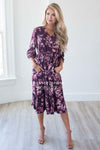 Our new Yvonne dress is a dream come true! From the beautiful color scheme to the fit and details, this dress will be timeless for years to come. Gorgeous plum dress features a floral print, wrap front bodice, 3/4 length sleeves and a gathered waist with waist tie sash.