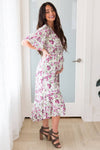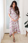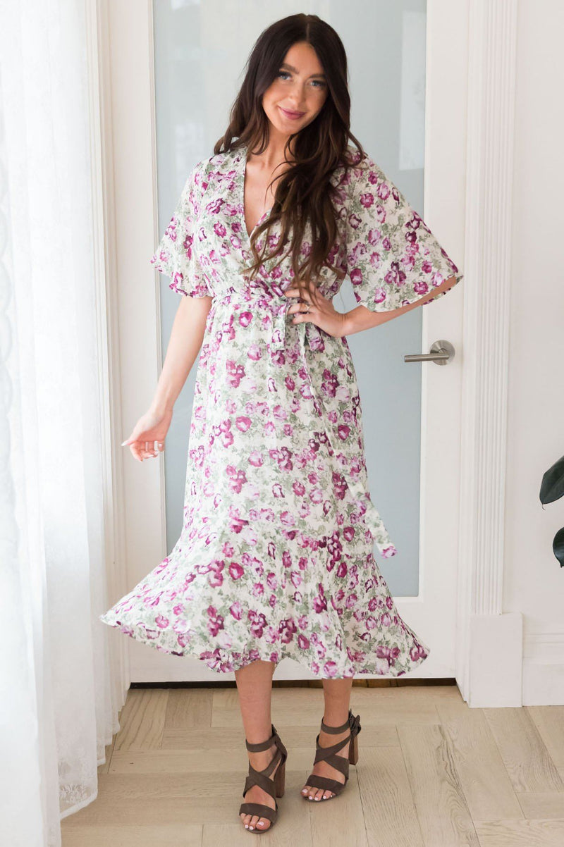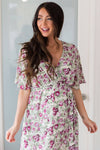 We are overjoyed to welcome the Zander this season and know you will be too! The fabulous flowy ruffle high-low skirt, half length bell sleeves, and cross-over bodice is just perfect for summer & for nursing mama's! We adore this purple and green floral print!